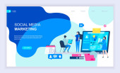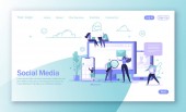 Koncepcja social media płaska strona lądowania. Zespół marketingu tworzenia wysokiej jakości treści wideo dla mediów społecznościowych wektor ilustracji. Reklama internetowa promocja strony internetowej kompozycja z postaciami ludzi
