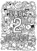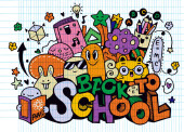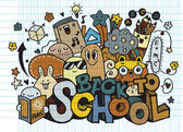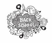 Koncepcja edukacji. Tło szkolne z ręcznie rysowanych materiałów szkolnych i bańki komiczne mowy z Powrót do szkoły liternictwo w stylu pop art