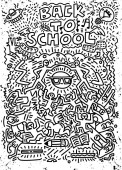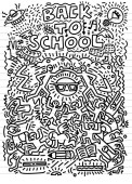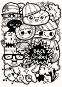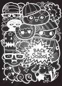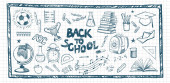 Koncepcja edukacji. Tło szkolne z ręcznie rysowanych materiałów szkolnych i bańki komiczne mowy z Powrót do szkoły liternictwo w stylu pop art