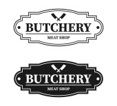Odznaka sklepu mięsnego Rzeźnika lub Etykieta z nożem do steków i kuchni. Wektor Vintage typografia projekt logo ze stekiem, sylwetka nóż kuchenny. Elementy na temat sklepu mięsnego, rynku, restauracji