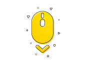 Przewijanie znaku strzałki. Przesuń ikonę myszy. Symbol przewijania stron lądowania. Żółte kółka. Klasyczna ikona. Elementy geometryczne. Wektor