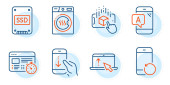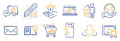 Zdjęcie "Zestaw ikon technologicznych, takich jak czat wiadomości, Hdd. Certyfikat, uratować planetę. Uszkodzone akta, maszyna do suszenia, pipeta chemiczna. Serwis z notatnikami, rozszerzona rzeczywistość, kawiarnia. Wektor" może być wykorzystywane do celów osobistych i komercyjnych zgodnie z warunkami zakupionej licencji Royalty-free. Obraz jest dostępny do pobrania w jakości wysokiej rozdzielczości do 5760x3840.
