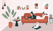 Młoda kobieta trenująca sport. Cute happy girl wykonywania gimnastyczne hantle ćwiczenia w domu. Płaskie kolorowe wektor ilustracji.
