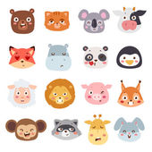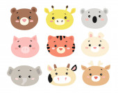 Kolekcja wektorowa afrykańskich słodkich zwierząt - żyrafa, antylopa, małpa, hipopotam, słoń, flaming, lew. Ręcznie rysowany zestaw zwierząt safari twarz i głowa w płaskim stylu.Izolowany na białym tle. Do projektowania