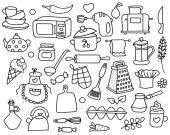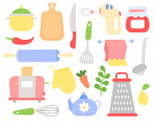 Kolekcja wektorowa jasnych ręcznie rysowanych naczyń kuchennych, takich jak wałek, toster, patelnia, tarka, nóż, czajnik, deska do krojenia, mikser, jar.Set narzędzi kuchni, naczynia i akcesorium.Izolowane na białym tle.