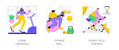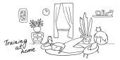 Sport i aktywność fizyczna w domu. Młoda kobieta trenuje, dopasowuje się w domu. Podczas kwarantanny pozostańcie aktywni fizycznie. Ręcznie rysowane płaski wektor ilustracja.