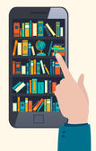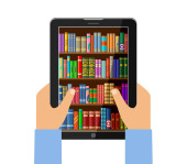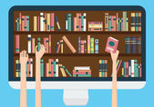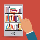Ręce trzymające tablet z książkami na ekranie. Mobilna koncepcja czytania. Wektor płaska ilustracja