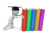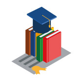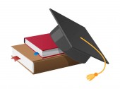 Isometryczna ilustracja wektorowa sterty książek, drabiny w jej pobliżu i kwadratowa czapka akademicka na wierzchu. Koncepcja wiedzy i czytania