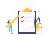 Zadanie wykonane koncepcja biznesowa malutka osoba z megafonem, szkło powiększające w pobliżu gigantyczny schowek pełna lista kontrolna.