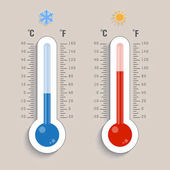 Gorące i zimne termometry. Niebieskie i czerwone termometry. Termometry meteorologiczne Celsjusza i Fahrenheita mierzące ciepło i zimno. Ilustracja wektora.