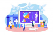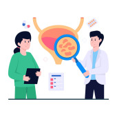 Mały lekarz zespół badania ludzkiego żołądka, charakter linii męski kobieta personel naukowy przeprowadzić eksperyment izolowany na białym, płaski wektor ilustracji.