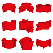 Zestaw czerwonych, izolowanych wstążek banerowych na białym tle. Prosta płaska ilustracja wektora. Z miejscem na tekst. Nadaje się do infografik, projektowania, reklamy, wakacji, etykiet.