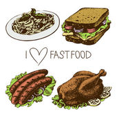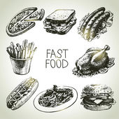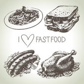 Ręcznie narysowany zestaw kanapki ze stekiem, skrzydełka z kurczaka, ziemniaki z tyłu, kanapka z wołowiną. Wektor czarno-białe ilustracje vintage