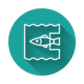 Biała linia Ikona akwarium izolowane z długim cieniem. Akwarium dla zwierząt domowych i domowych. Zielony przycisk koła. Wektor.