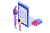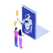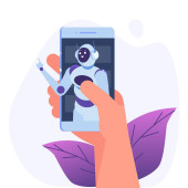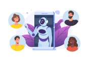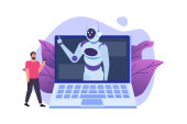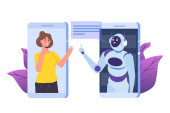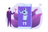 Koncepcja Chatbota. Człowiek rozmawiający z robotem. Obsługa klienta android, sztuczna inteligencja dialog .