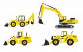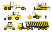 Specjalne pojazdy do budowy dróg. Stylowe uproszczone ikony. Grafika wektorowa