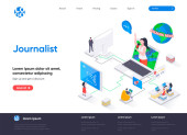 Bloguję izometryczną stronę lądowania. Produkcja treści społecznościowych, komunikacja sieciowa, zamieszczanie stron internetowych i izometria wiadomości. Strona internetowa płaski szablon, wektor ilustracji z postaciami ludzi.