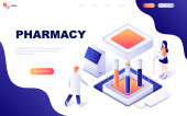 Izometryczna strona lądowania medycyny. Nowoczesna diagnostyka i leczenie w klinice, badania laboratoryjne i izometria opieki zdrowotnej stronie internetowej. Strona internetowa płaski szablon, wektor ilustracji z postaciami ludzi