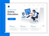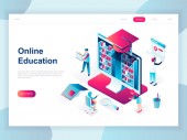 Wykształcenie online izometryczna strona lądowania. Usługa uczenia się na odległość, kursy zawodowe i rozwój umiejętności strona internetowa izometrii. Strona internetowa płaski szablon, wektor ilustracji z postaciami ludzi.