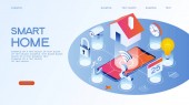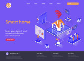 Izometryczna strona lądowania inteligentnego domu. Online sterowanie domem, monitorowanie i zarządzanie, strona internetowa automatyzacji systemu domu. Strona internetowa płaski szablon, wektor ilustracji z postaciami ludzi.