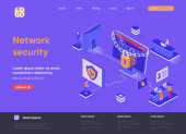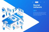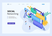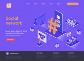 Izometryczna strona lądowania sieci społecznej. Komunikacja internetowa, udostępnianie treści w mediach społecznościowych, zamieszczanie strony internetowej poświęconej izometrii komunikatów. Strona internetowa płaski wektor ilustracja z postaciami ludzi.
