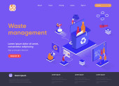 Izometryczna strona lądowania dotycząca gospodarki odpadami. Kontrola i zarządzanie utylizacją odpadów, zbieraniem odpadów i sortowaniem strony internetowej izometrii. Strona internetowa płaski wektor ilustracja z postaciami ludzi.