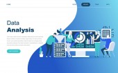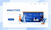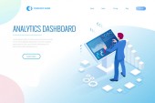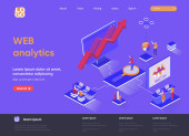WEB analityka izometryczna strona lądowania. Internetowa analityka biznesowa, usługa analizy danych, strona internetowa izometrii informacji giełdowych. Strona internetowa płaski szablon, wektor ilustracji z postaciami ludzi.