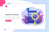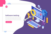 Testowanie oprogramowania izometryczna strona lądowania. Testy oprogramowania i zapewnienie jakości, wyszukiwanie błędów i proces analizy izometrii strony internetowej. Szablon strony internetowej, ilustracja wektorowa z postaciami ludzi.
