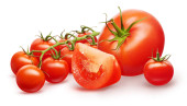 Pomidor z połową i plasterki izolowane na białym tle. Ścieżka wycinania i pełna głębia pola. Widok góry. Układy płaskie