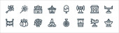 ikony parku rozrywki. zestaw liniowy. wysokiej jakości zestaw linii wektorowych, takich jak podstawka, balon na gorące powietrze, zderzaki, diabelski młyn, zjeżdżalnia wodna, popcorn, kawa, fajerwerki