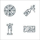 Ikony sławy. zestaw liniowy. wysokiej jakości zestaw linii wektorowych, takich jak bukiet kwiatów, reflektor, koktajl