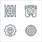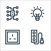 elektronarzędzia i ikony linii. zestaw liniowy. wysokiej jakości zestaw linii wektorowych, takich jak lampa stołowa, niebezpieczeństwo elektryczne, multimetr, płyta rozdzielcza, obwód elektryczny, wtyczka zasilania, elektryk, opór