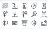 ikony inteligentnych linii rolnych. zestaw liniowy. wysokiej jakości zestaw linii wektorowych, takich jak sprzedaż, smart farm, smart farm, info, machine, info, milk, stodoła, DNA