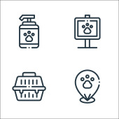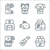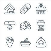 ikony linii zwierząt domowych. zestaw liniowy. wysokiej jakości zestaw linii wektorowych, takich jak sklep zoologiczny, akwarium, kąpiel, piłka, znieczulenie, szczotka do zwierząt domowych, kroplomierz, dom dla kotów