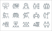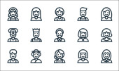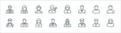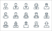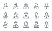 ikony zawodów. zestaw liniowy. zestaw linii wektorowych jakości, takich jak pielęgniarka, strażak, hydraulik, call agent, policjant, menedżer, listonosz