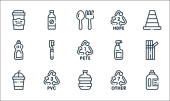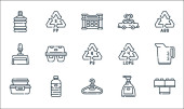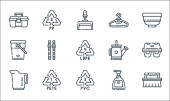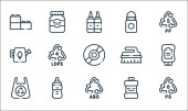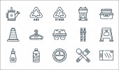 ikony linii produktów z tworzyw sztucznych. zestaw liniowy. wysokiej jakości zestaw linii wektorowych, takich jak miarka, CD, recykling, skrzynka narzędziowa, opakowanie, sos, szczotka do czyszczenia, recykling, zabawka samochodowa