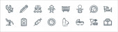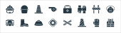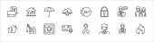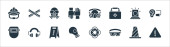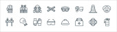 płaskie ikony ratownicze i ochronne. zestaw liniowy. wysokiej jakości zestaw linii wektorowych, takich jak ochrona ucha, ostrzeżenie, maska gazowa, blokada drogi, ostrzeżenie, maska spawalnicza, ochrona ucha