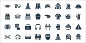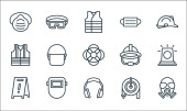 płaskie ikony ratownicze i ochronne. zestaw liniowy. wysokiej jakości zestaw linii wektorowych, takich jak maska gazowa, stożek, blokada drogi, kask policyjny, maska gazowa, kamizelka ratunkowa, kask, boi ratunkowej, ochrona ucha