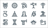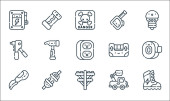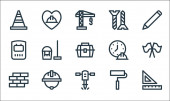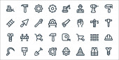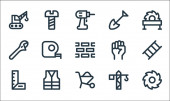 ikony dnia pracy. zestaw liniowy. wysokiej jakości zestaw linii wektorowych, takich jak sierp, łopata, młotek, piła ręczna, piła, ściana z cegły, dźwig, farba rolkowa, taczka