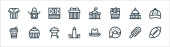 ikony z lipca. zestaw liniowy. wysokiej jakości zestaw linii wektorowych, takich jak fajerwerki, Kapitol, pączek, kij baseballowy, tv, grill, babeczka