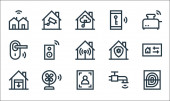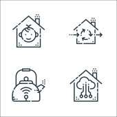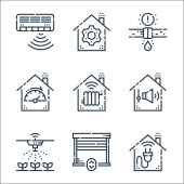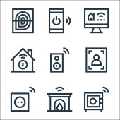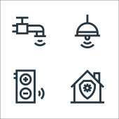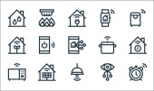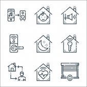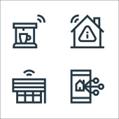 płaskie ikony linii smarthome. zestaw liniowy. wysokiej jakości zestaw linii wektorowych, takich jak inteligentne śmieci, pilot zdalnego sterowania, niebezpieczeństwo, smarthome, bezpieczeństwo, kłódka, mikrofon, kuchenka mikrofalowa, sterowanie