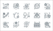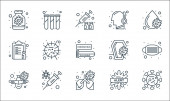 ikony linii koronawirusów. zestaw liniowy. wysokiej jakości zestaw linii wektorowych, takich jak: brak lotu, ostrzeżenie o podróży, bakterie, mycie rąk, probówka, dezynfektor rąk, książka medyczna, katar, dezynfektor rąk