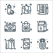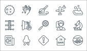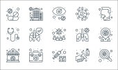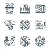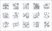 ikony linii koronawirusów. zestaw liniowy. zestaw linii wektorowych jakości, takich jak dezynfekcja rąk, apteczka pierwszej pomocy, zainfekowane płuca, koronawirus, bez lotu, stetoskop, na całym świecie, zamknięty