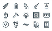 elektronarzędzia i ikony linii. zestaw liniowy. wysokiej jakości zestaw linii wektorowych, takich jak młot, elektryk, wtyczka, szczypce, moc, tester, kamizelka, śrubokręt, stripped