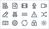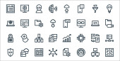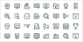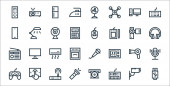 ikony komunikacji i linii mediów. zestaw liniowy. wysokiej jakości wektor linii zestaw, takich jak laptop, mikrofon, vhs, odtwarzacz muzyki, aparat fotograficzny, usb, kamerka internetowa, odtwarzacz muzyki, tv