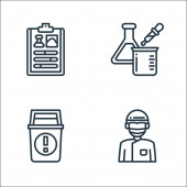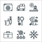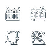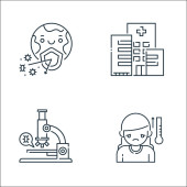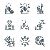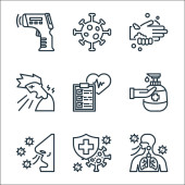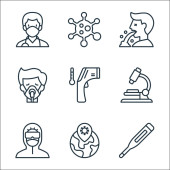 zakażenie wirusem i ikony linii. zestaw liniowy. zestaw linii wektorowych jakości, takich jak raport, wirus, termometr, człowiek, wirus, kontrola, mikroskop, strzykawka