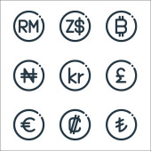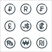 ikony linii walutowych. zestaw liniowy. wysokiej jakości zestaw linii wektorowych, takich jak dolar, japoński jen, rupia, wygrał, tajski baht, kuba, laos, vietnam