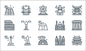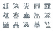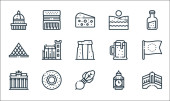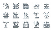 ikony linii europejskiej. zestaw liniowy. wysokiej jakości zestaw linii wektorowych, takich jak piłka nożna, małże, brama, kask, Alpy, pizza, wiatrak, duży ben, sagrada familia
