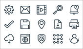 ikony linii interfejsu użytkownika. zestaw liniowy. wysokiej jakości zestaw linii wektorowych, takich jak przycisk odtwarzania, okulary przeciwsłoneczne, trybik, powiadomienie, gwiazda, dane, aktualności, touchpad, tarcza