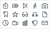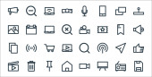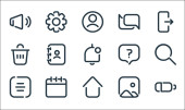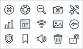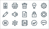 ikony linii interfejsu użytkownika. zestaw liniowy. zestaw linii wektorowych jakości, takich jak sprzęt, głośność, podgląd, mikrofon, odblokowanie, dom, ksero, anulowanie, usunięcie